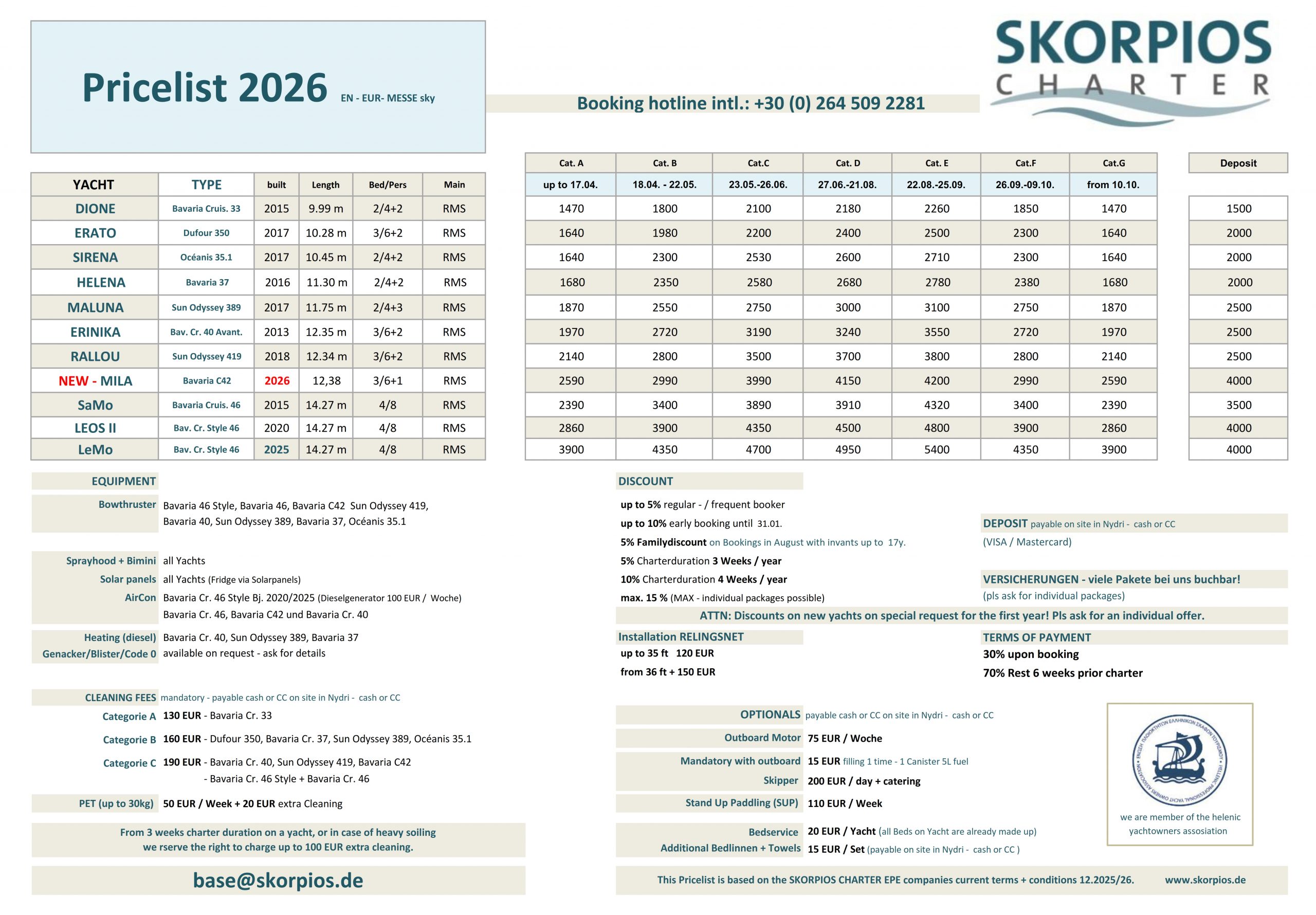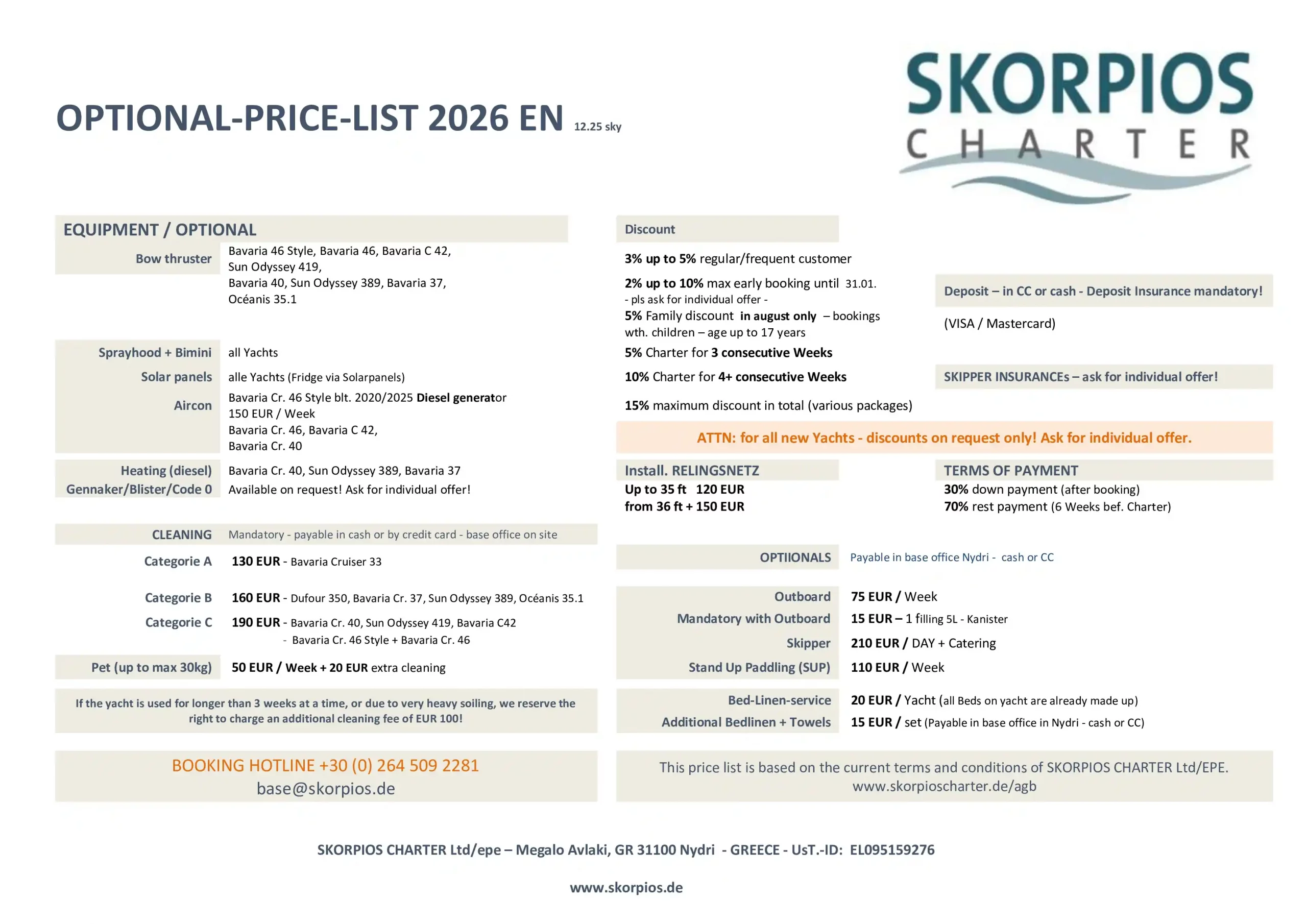 The amount of the deposit depends on the length of the yacht. Please see the latest pricelist.
