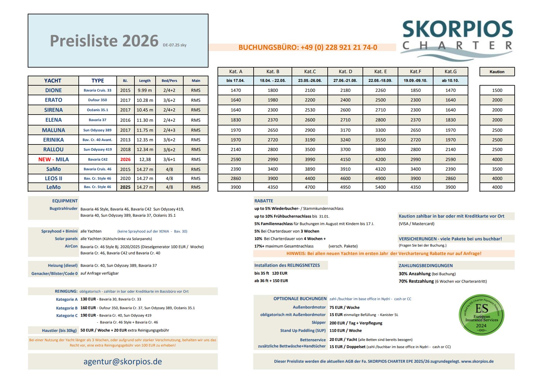 All yachts have fully comprehensive and German third party insurance, Skipper insurance, travel insurance,